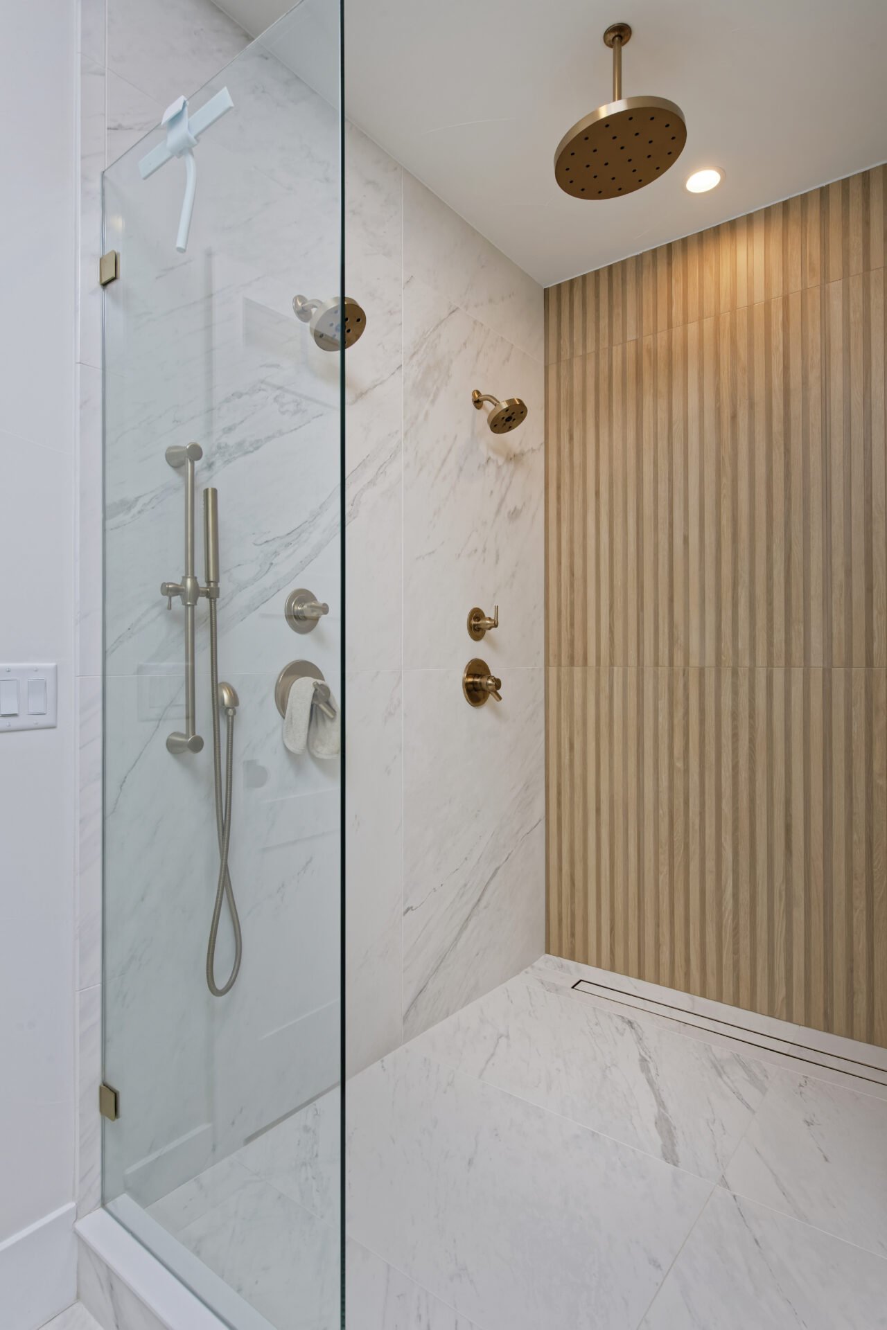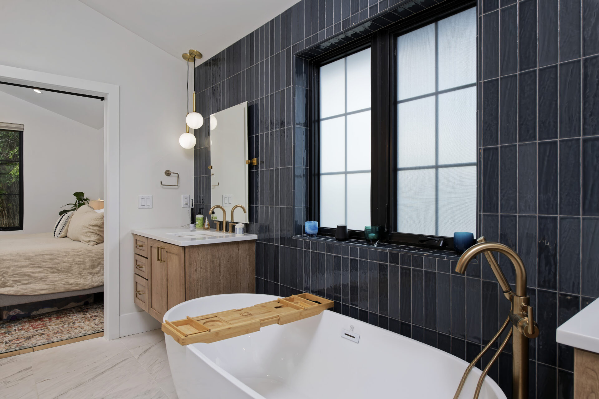 The primary suite offers a luxurious, spa-like bathroom retreat with a soaking tub, walk-in shower, and elegant finishes. The custom primary closet build-out adds a touch of luxury, providing ample storage and organization tailored to your lifestyle.